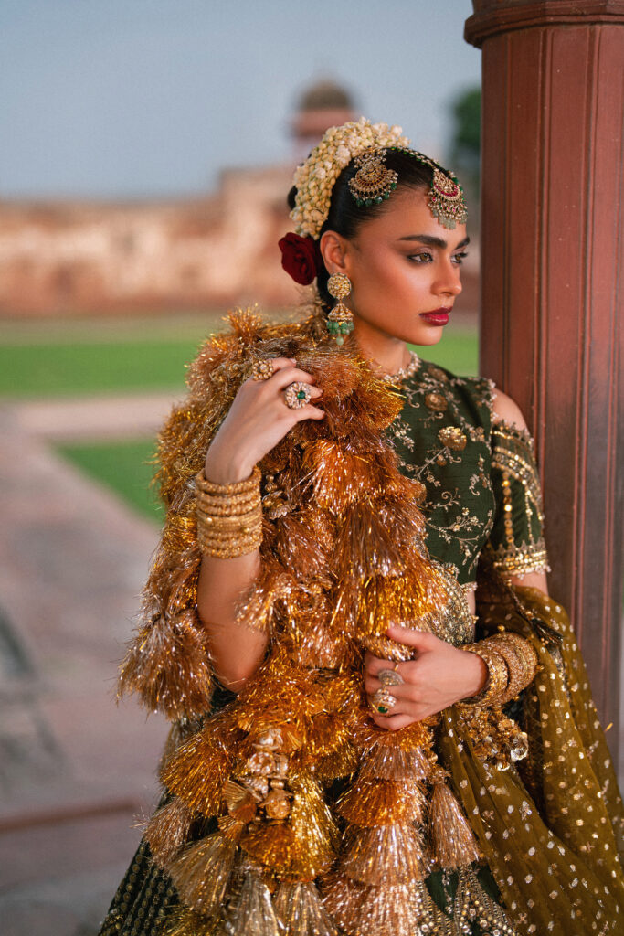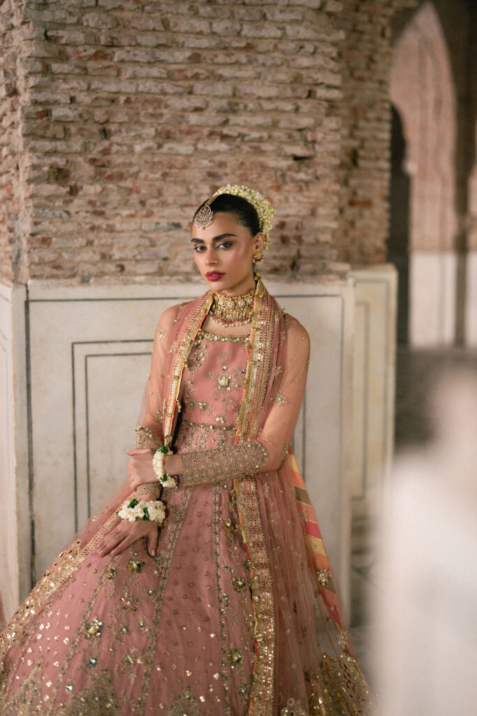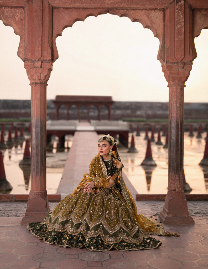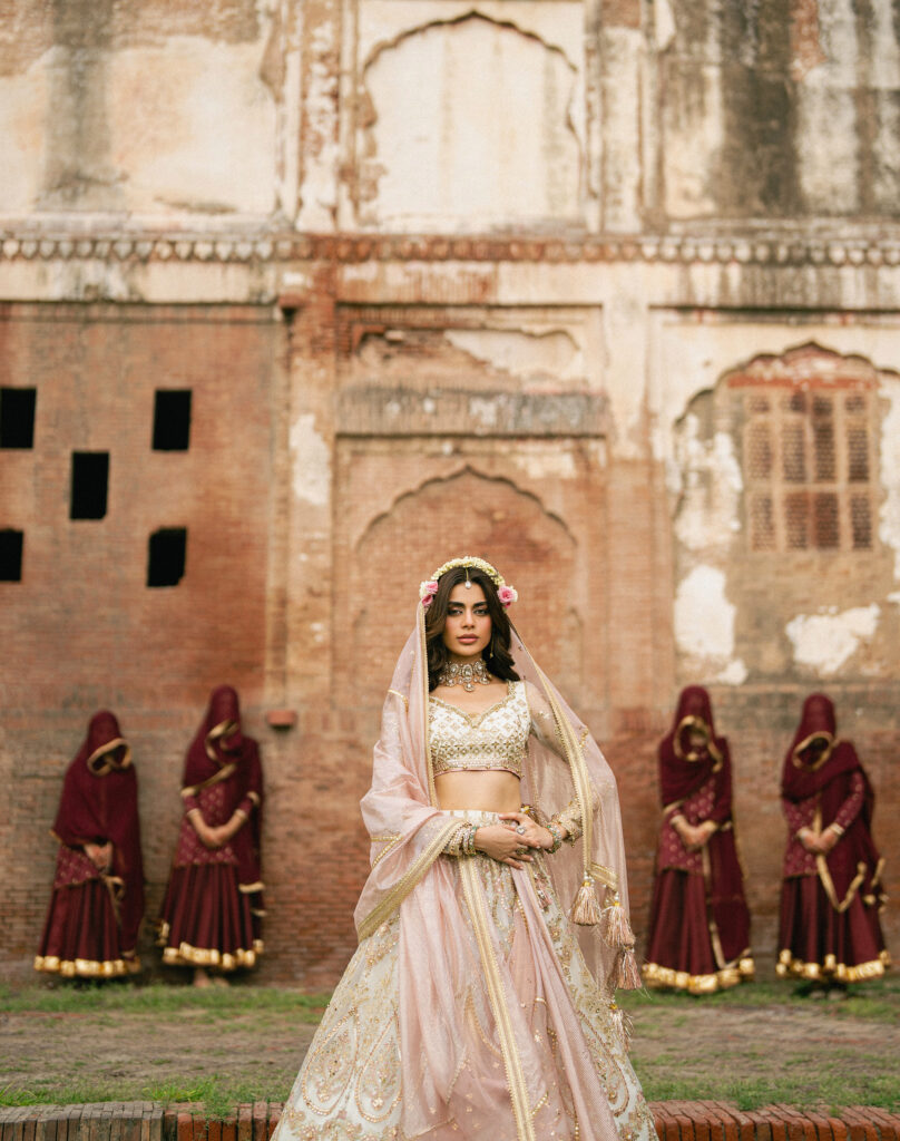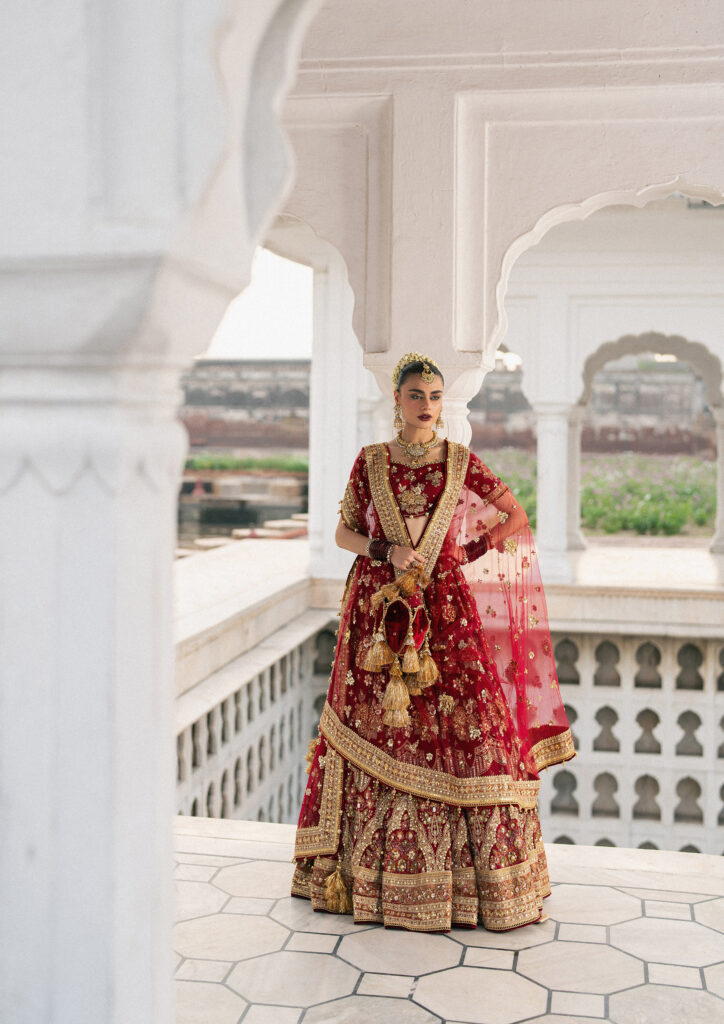 In Zarlish, that architectural language finds form in design. The embroidery—delicate resham, tilla, and zari—flows like carved marble jaalis, tracing symmetry and rhythm across textiles. The palette drifts from muted ivories and rose dusts to regal crimsons, each shade recalling the transition from concealment to revelation. Layered dupattas and fluid silhouettes mirror the architectural grace of domes and courtyards—spaces built to both shelter and celebrate light.